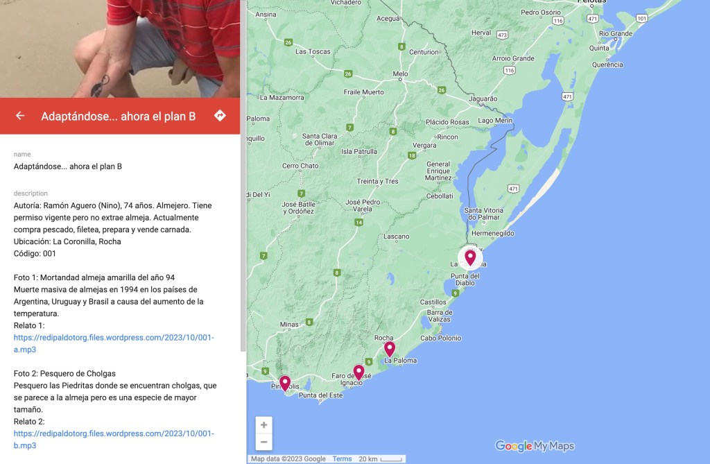- Localización espacial de las narraciones compiladas a través de la campaña del FotoVoz en un mapa que comunica al público con fotos y relatos hablados, cómo la pesca artesanal se ve impactada por varios factores del clima, cambios del entorno natural y otros aspectos socioecológicos.